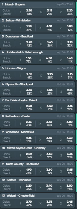 Som nämnt ovan finns det inte så stora favoriter – det är egentligen bara Bolton och Huddersfield som enligt oddsmarknaden har en vinstchans på över 50%. Resterande matcher är jämna sådana och vårt jobb blir att lägga ett pussel med en tydlig inriktning på spelvärde, utan att svårighetsgraden blir för hög.