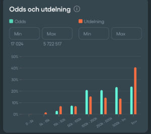 På bilden nedan är systemet som vi lagt in hos Reducering – vi ser tydligt att potentiell utdelning finns med goda möjligheter i det övre högre spannet, samtidigt som vi fångar upp även lägre utdelningar. Det finns också en generell övervikt mot mer värderader. Totaloddset – dvs svårigheten är inte för svår – men heller inte för enkel. En fin kombo vid denna typ av Jackpot-omgångar.