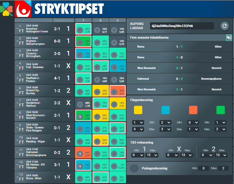 Ett annat sätt att följa resultatet på Stryktipset är att använda funktionen “liverättning” hos reducering.se, det fungerar oavsett om man har en aktiv kupong eller ej.