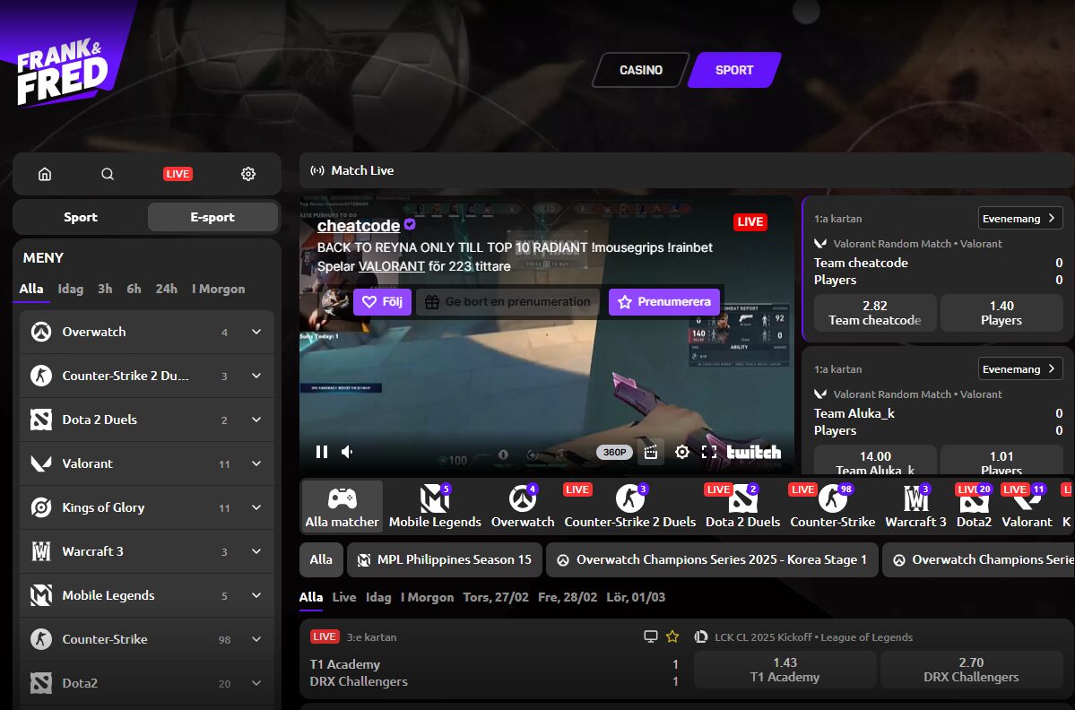 Det går inte att komma ifrån att de är extra vassa inom odds på E-Sport. Frank & Fred en helt egen avdelning för just E-sport och det erbjuds både livestreaming och mängder med spelaralternativ från ett brett utbud av E-sporter.
