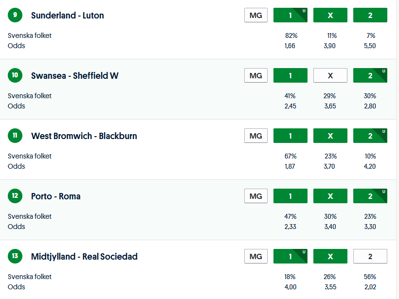 4️⃣Nu är det dags att sätta ut 7 st utgångstecken på de övriga 7 garderingarna - det görs genom att på markeringsrutan på valt tecken. Dessa garderingar adderat med 6 ogarderade matcher markeras i grundramen - som vi vill vikta systemet lite extra mot. I just detta system vill vi att 3-4 utgångstecken ska sitta för maximal chans på 13 rätt. En bra strategi är att inte “blanda” utgångstecken - det vill säga hålla sig antingen till favoriter eller skrällar beroende på hur omgången ser ut. Klicka på rutan tills ett visuellt u visar i högerhörnet (se bild nedan)
