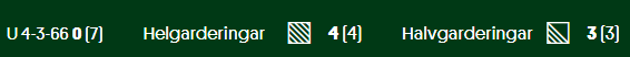 3️⃣Sätt ut dina matematiska garderingar. I informationsrutan längs ned ser vi vad som återstår att placera ut. I och med att det står 6[4] helgarderingar ch 3[3] halvgarderingar måste vi lägga till 2 matematiska det ska stämma med valda systemram (4-3).- vilket betyder att dessa garderingarna kommer att finnas i vårt system. Välj två stycken lämpliga MG bland helgaddarna
